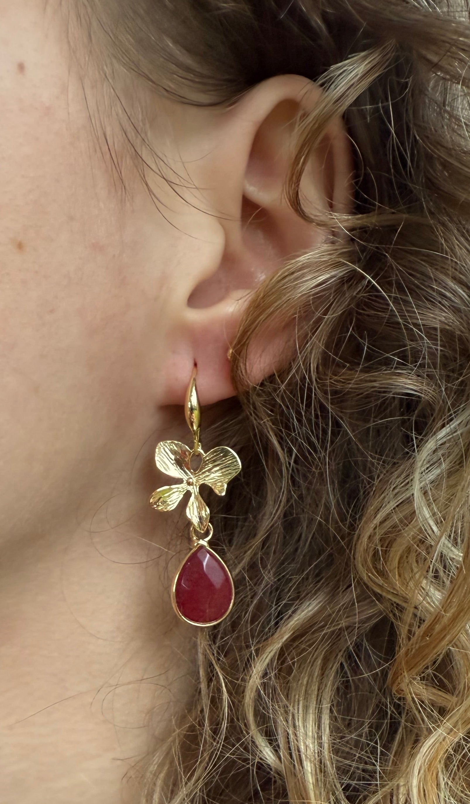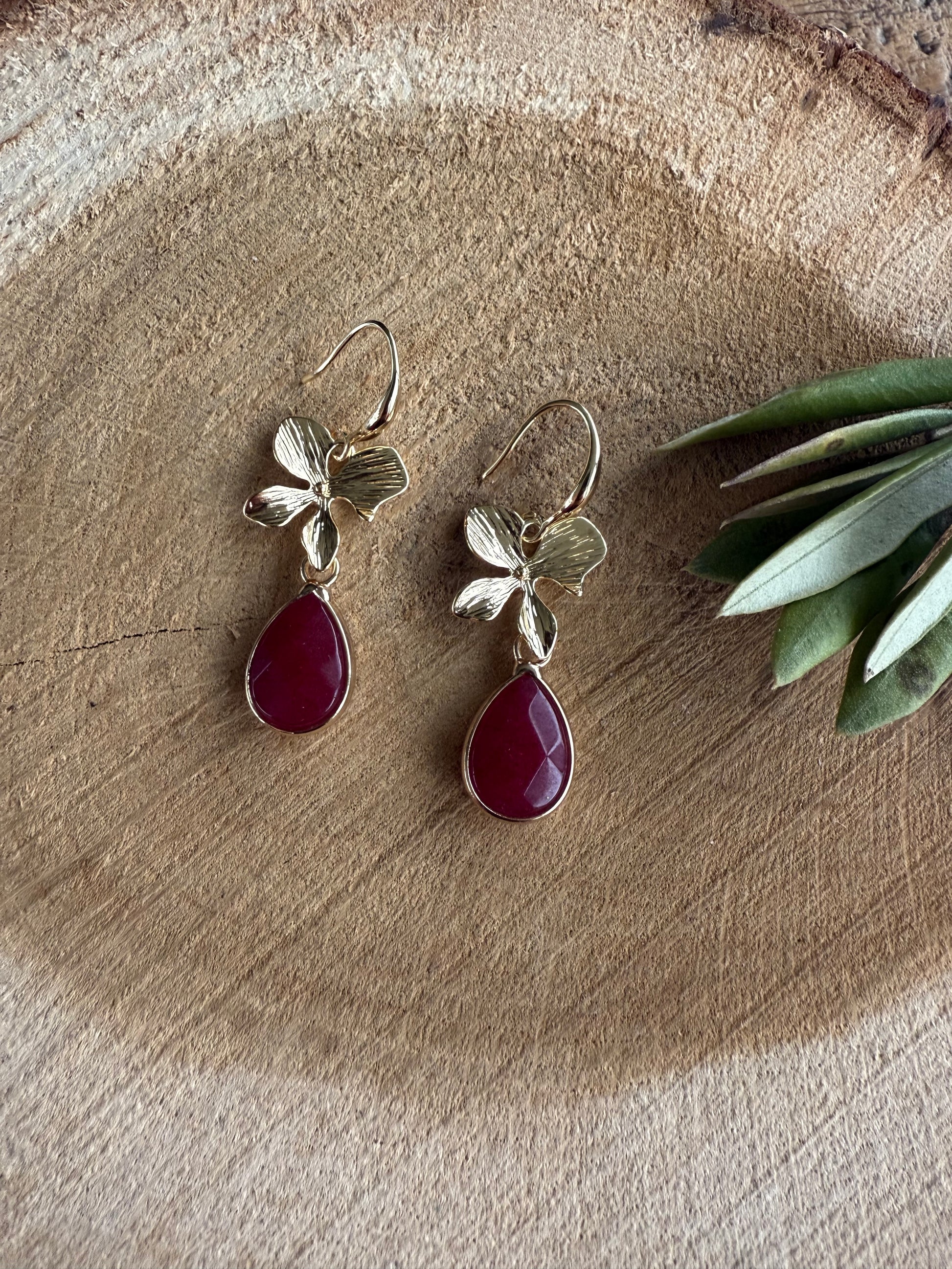 Kleine bordeauxrode natuursteen aan een bloem